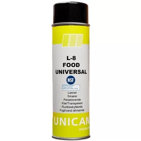 L-8 Food Universal multi-funktions produkt, er baseret på syntetiske olier med PTFE. Produktet er udviklet til at kunne løse mange forskellige opgaver overalt i fødevareindustrien. L-8 virker smørende, penetrerende, rustløsende, rustbeskyttende og fugtafvisende.